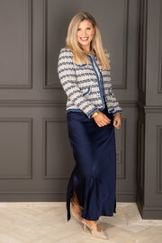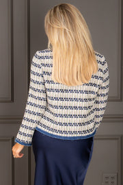 This Tweed Jacket features a rounded neckline, long sleeves, and a waist-length cut with a button-down front, crafted from stylish tweed material.