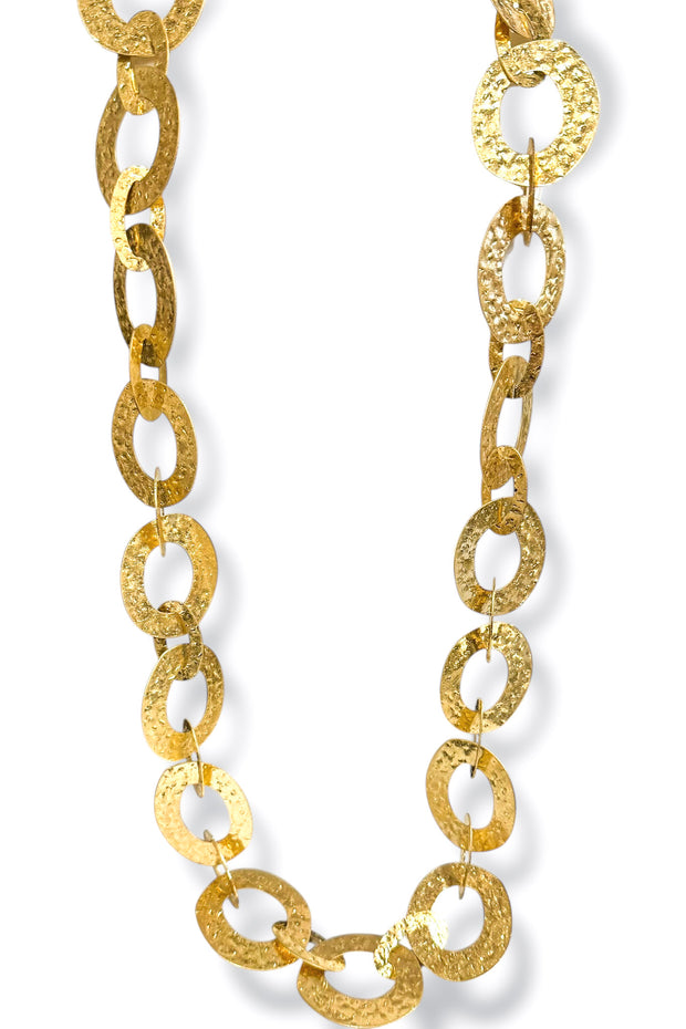Delicate hammered circle links cascade down this elegant gold necklace, creating movement and dimension. Perfect for layering or wearing solo.