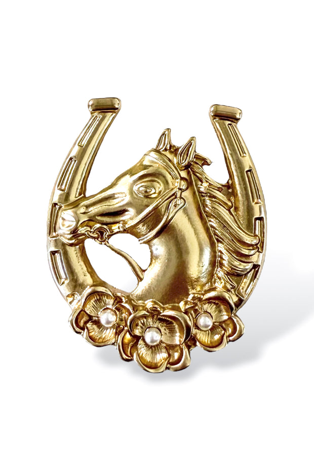 Elegant horseshoe brooch featuring a detailed horse head and delicate roses. Perfect for adding vintage charm to any outfit. Timeless equestrian-inspired accessory.