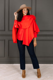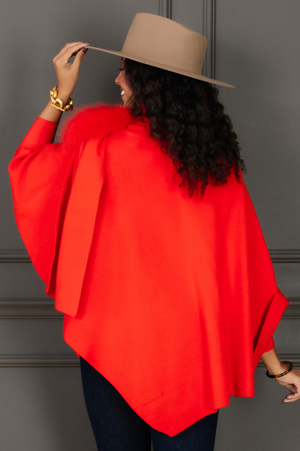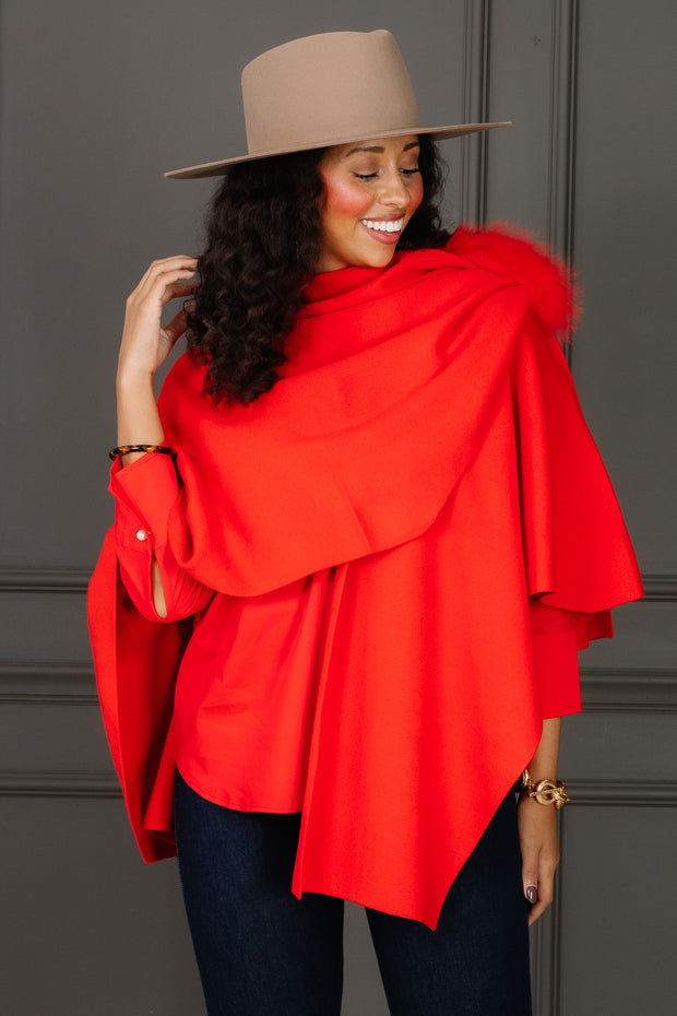 Stunning red poncho wrap crafted from soft, comfortable material. Features genuine fur loop detail for effortless styling and luxe appeal. Versatile layering piece that elevates any winter wardrobe with timeless elegance.