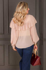 This fawn-colored long sleeve blouse features a tie neck and delicate ruffles for a flowy, dainty look. Made from breathable fabric, it offers comfort and elegance perfect for any occasion.