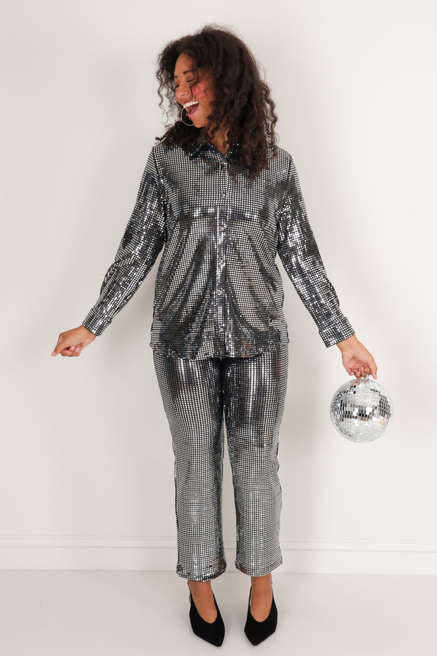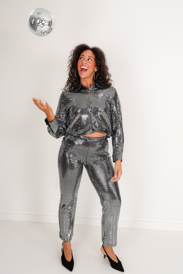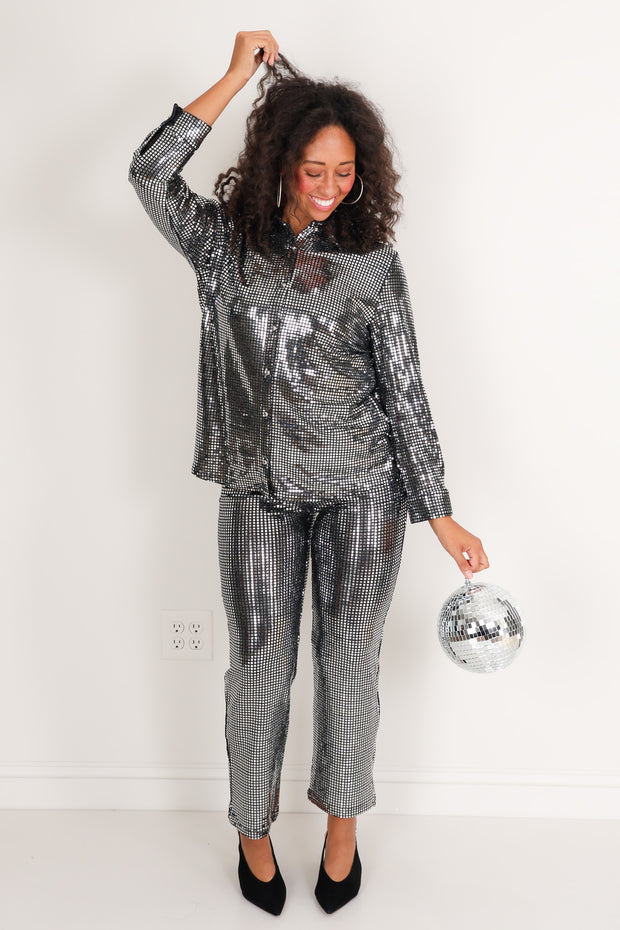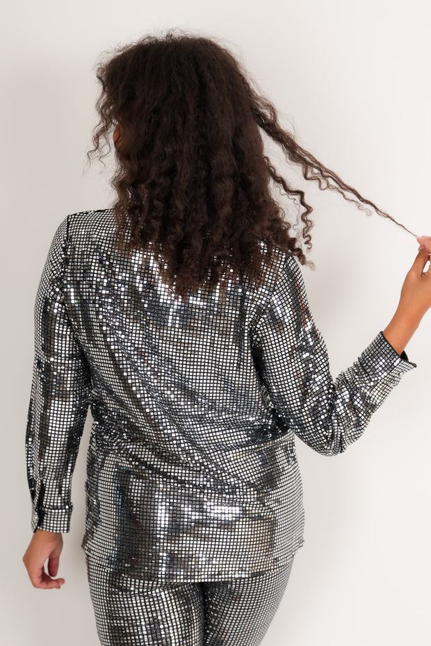 This Blouse features a sleek top collar and long sleeves, designed to hit at the waist for a flattering fit. Its button-down front adds classic detail, while the metallic fabric gives it a stylish, shimmering look perfect for evening outings or festive occasions.