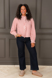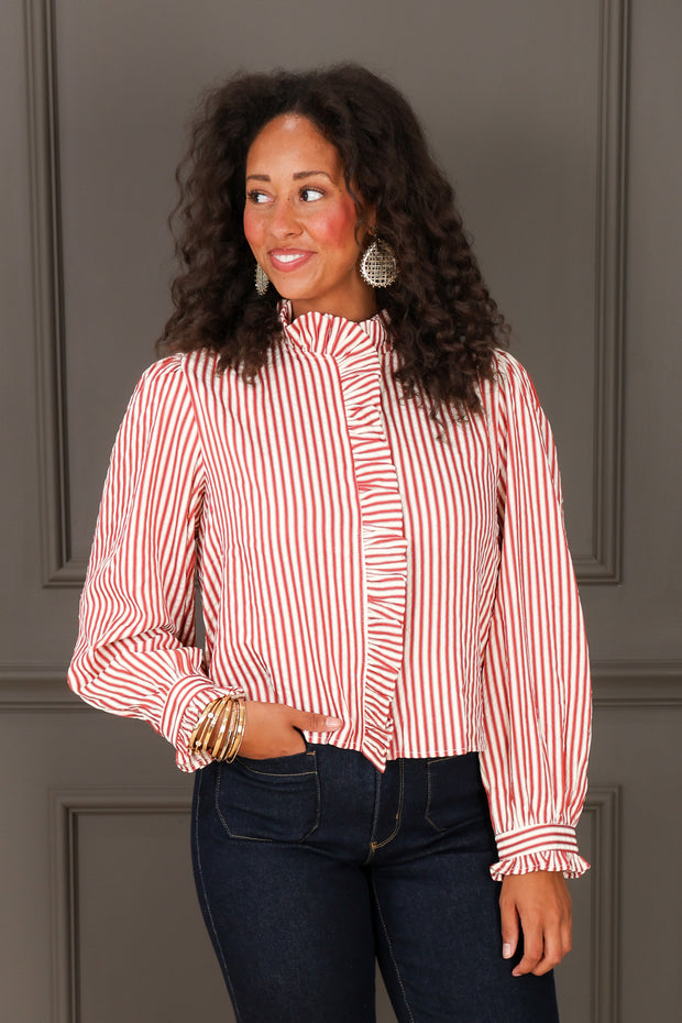 The Made in Time Red Striped Button Down Long Sleeve Top features a classic red and white pinstripe pattern with a ruffled collar and detailed accents. Its button-down design offers a polished look while keeping you comfortable throughout the day.