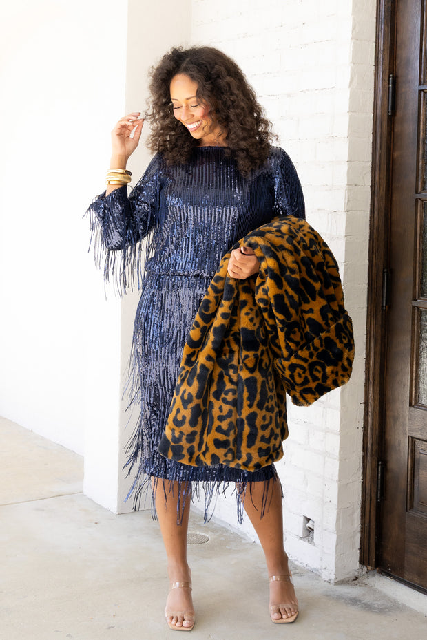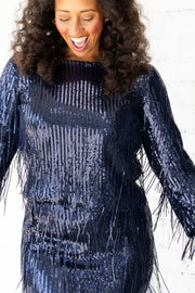 This waist-length blouse features a rounded neckline, long sleeves, a dazzling sequin bodice, and playful fringe detailing for a stylish, eye-catching look perfect for any occasion.