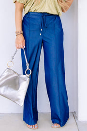 This Denim Wide Leg Pant features an front button closure for easy wear and a comfortable fit. It includes convenient side pockets and a waist tie to adjust the fit to your preference.