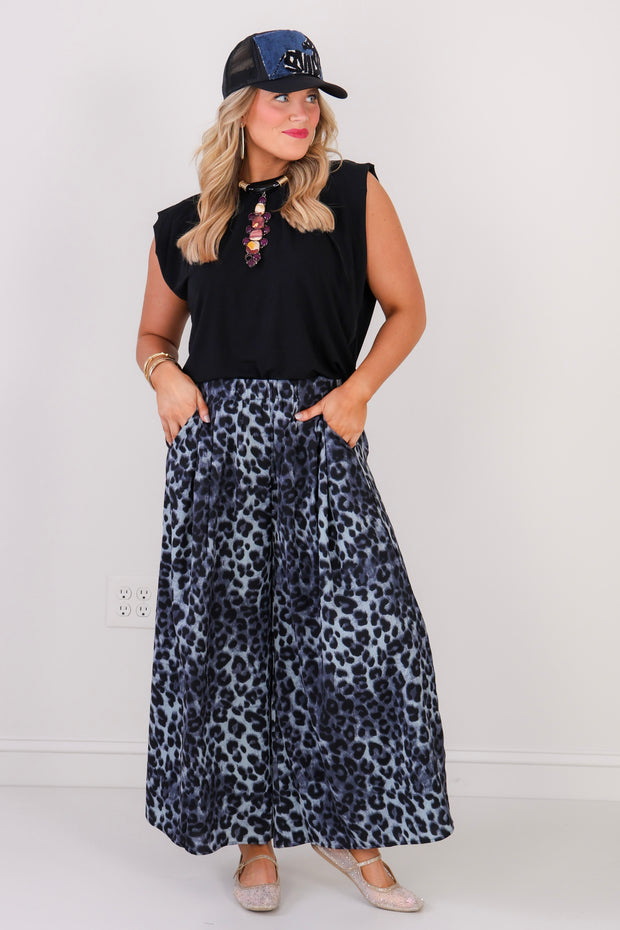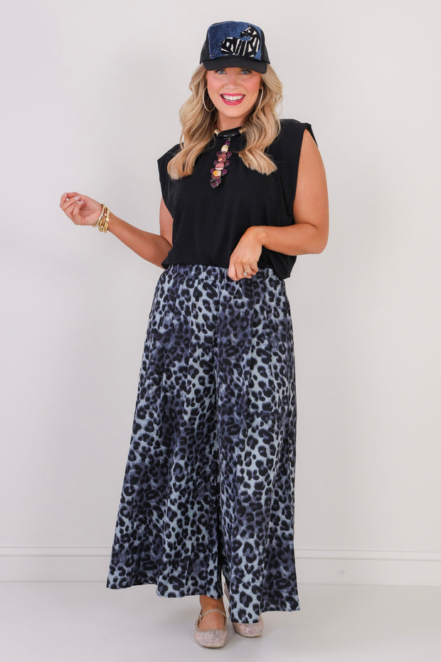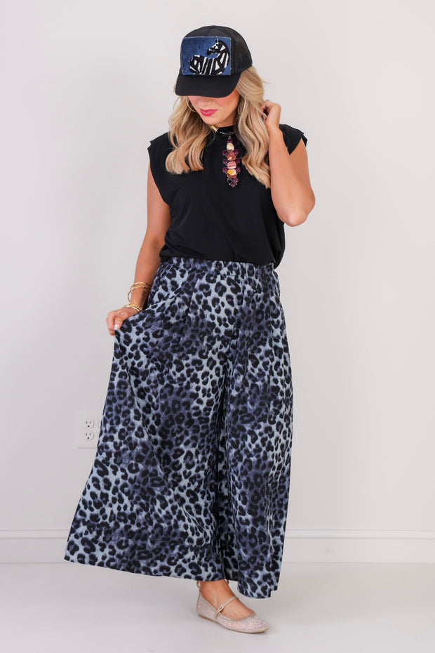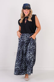 These grey mix animal print wide leg pants feature an elastic pull-on waistband for easy wear and comfort. Designed with a flattering wide leg silhouette and practical side pockets, they combine style and functionality for everyday ease.