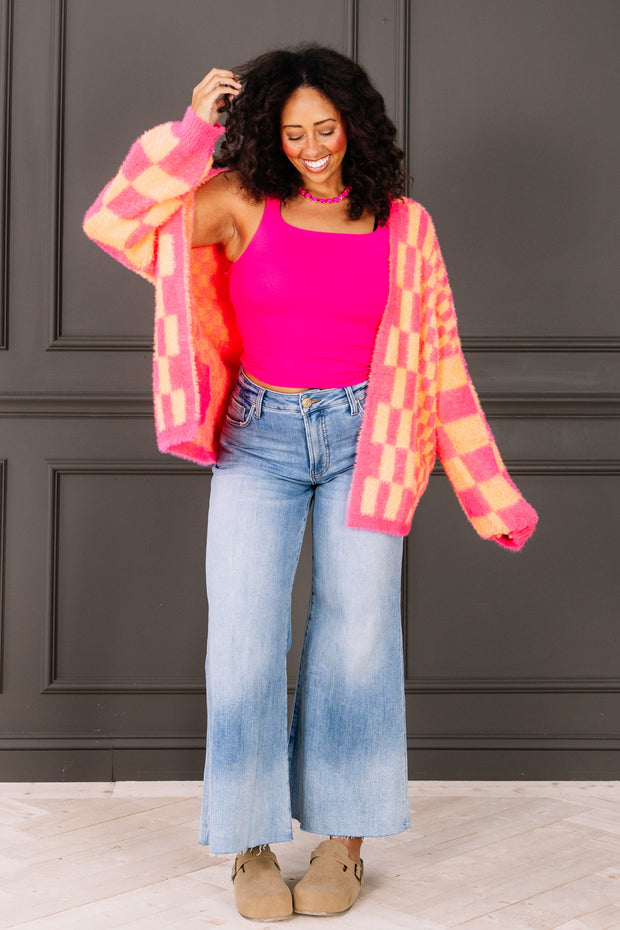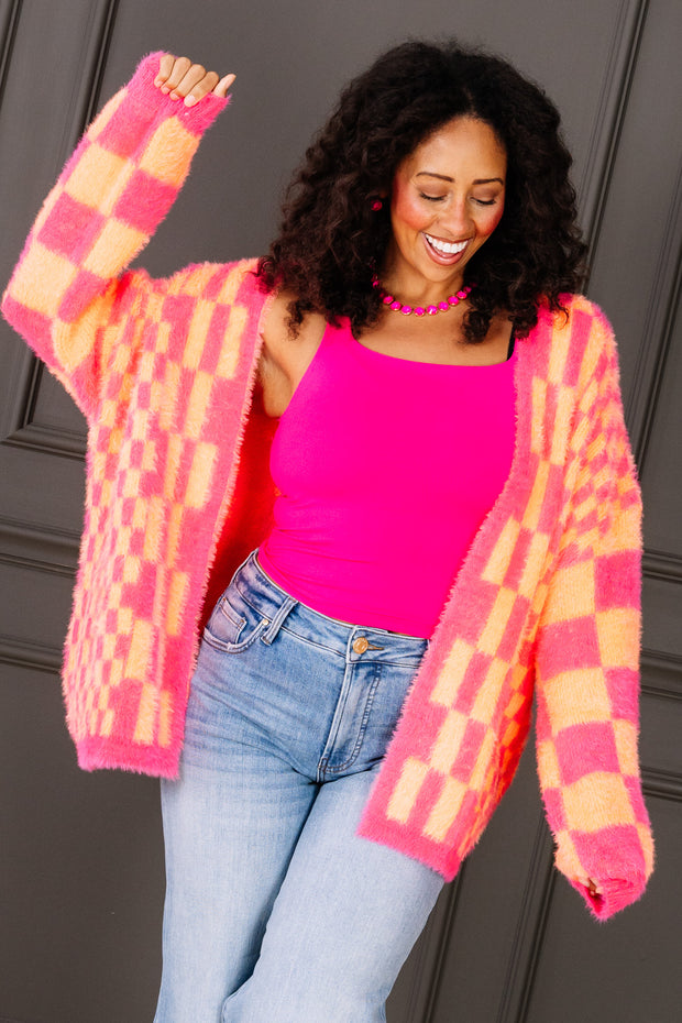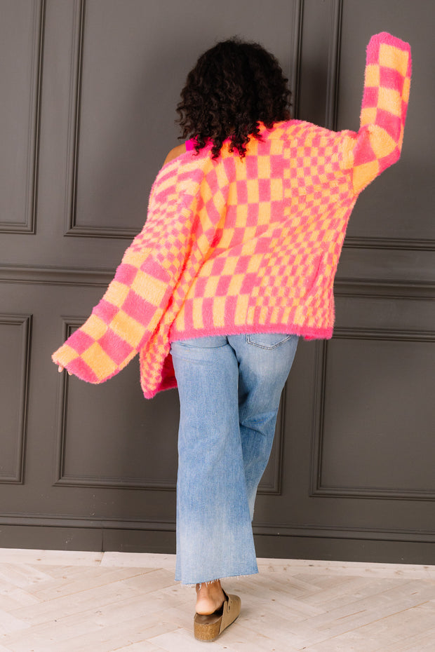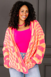 This pink and orange checkered cardigan features an open front design and long sleeves, offering a comfortable fit that ends at the waist. Its vibrant checkered pattern adds a playful touch to any outfit while keeping your look casual and stylish.