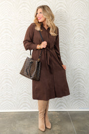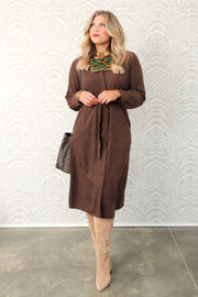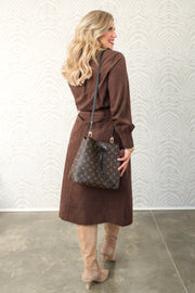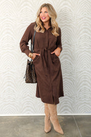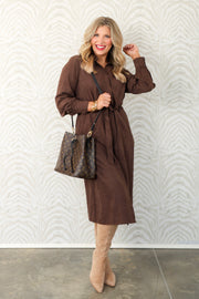 This Dress features a top collar and long sleeves for a classic look. Made from soft suede material, it offers comfort and style. The dress falls to a flattering midi length and includes a button-down front for easy wear.