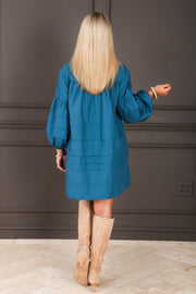 The By the Sea Teal Long Sleeve Dress features a button-down front, long puff sleeves, and a flattering multi-tiered design. Made from breathable, comfortable fabric, it includes a side pocket for added convenience and style.
