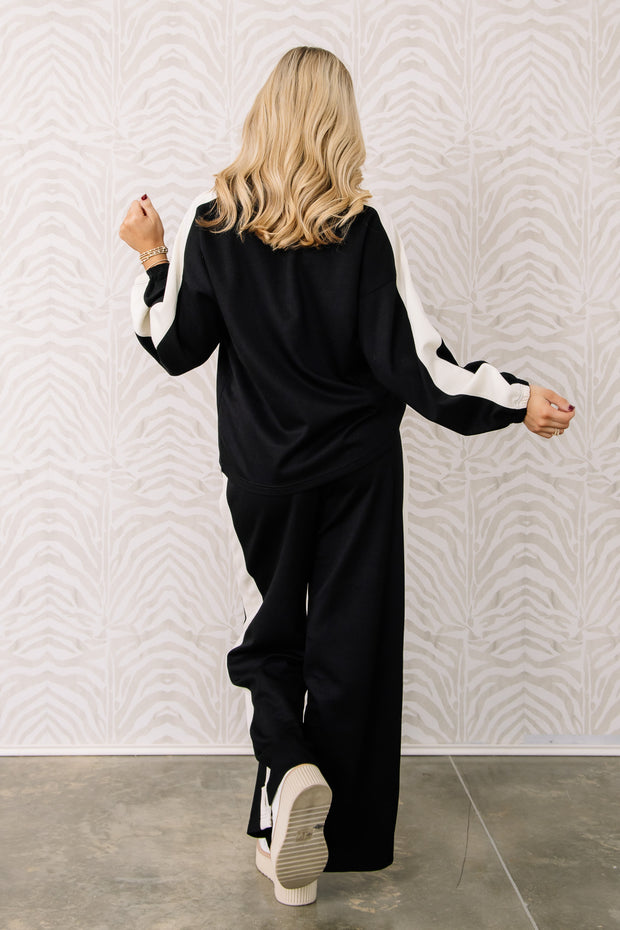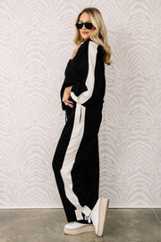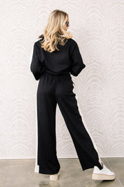 Sleek black wide-leg pants with a crisp white side stripe. Elastic drawstring waistband and side pockets deliver comfort and convenience, while breathable fabric keeps you at ease all day long.