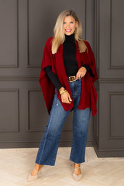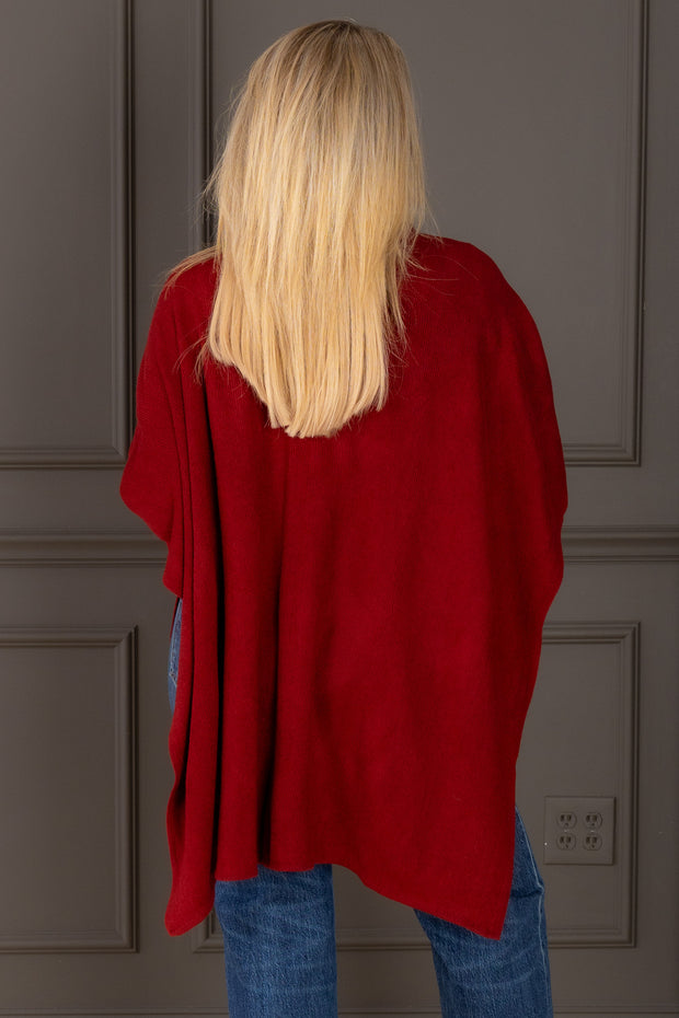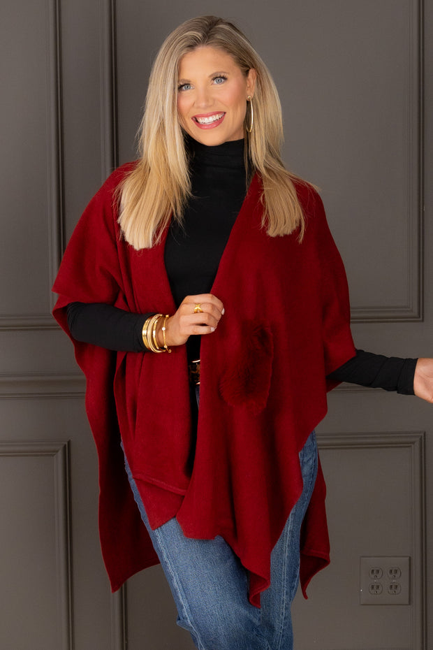 Stay cozy and stylish with this red poncho. Featuring a solid knit design with a luxurious fur strap trim, this ruana-style poncho adds warmth and elegance to any outfit. Perfect for layering on chilly days, it offers comfort without compromising on fashion.