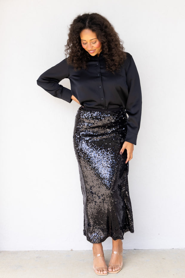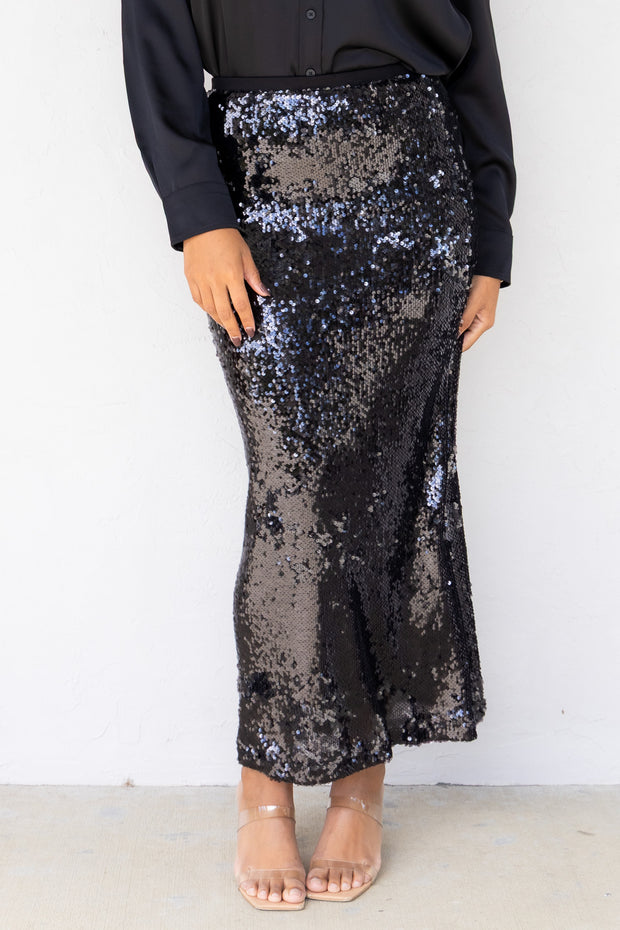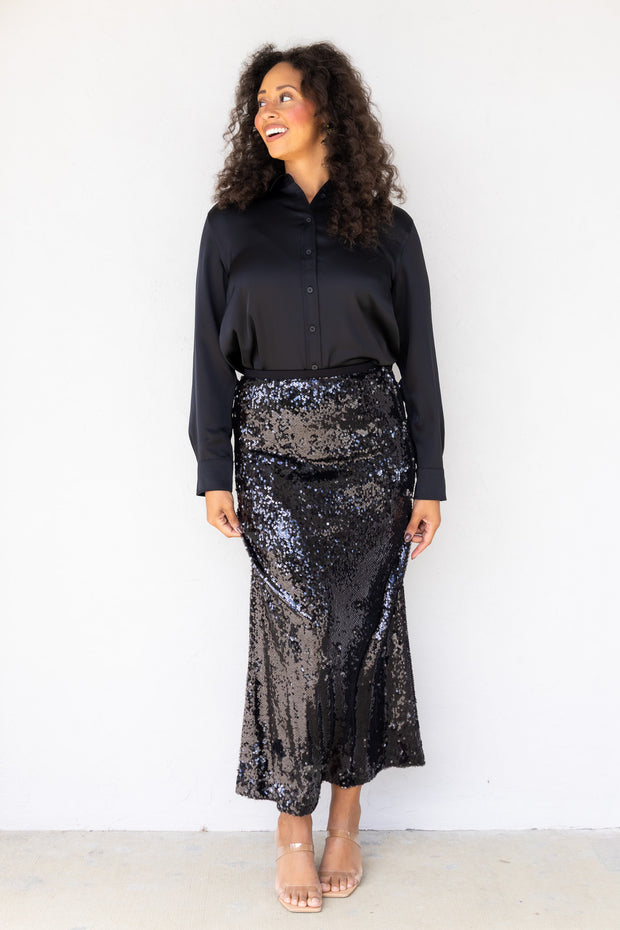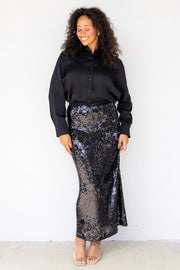 This maxi skirt will add a touch of glamour to any outfit. The sequin bodice adds sparkle, while the pull on waistband ensures a comfortable fit. Perfect for any occasion where you want to stand out.