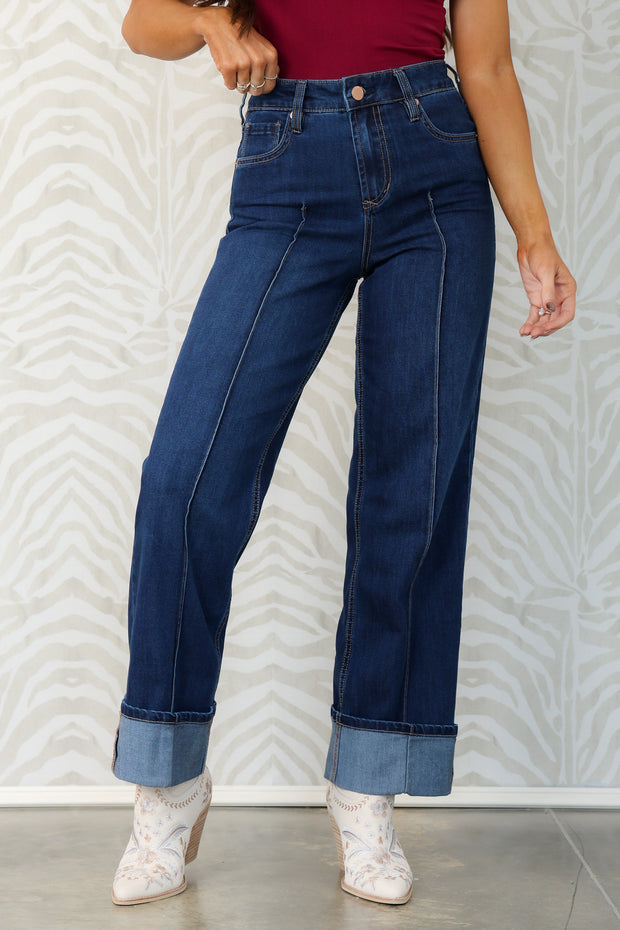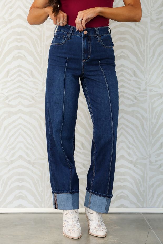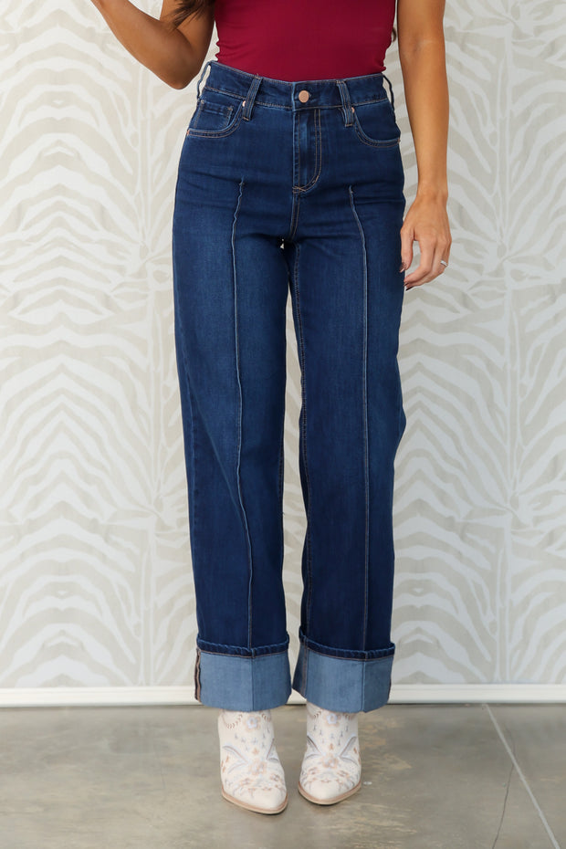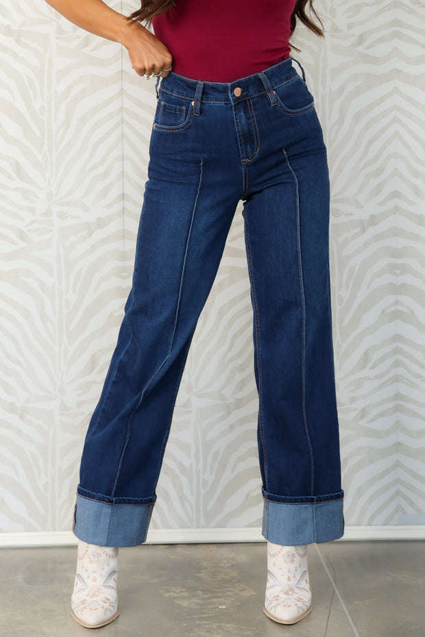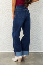The Holly Dark Denim Wide Leg Cuffed Jean features a high-rise fit and wide legs with stylish cuffs. It includes subtle line detailing on the front and practical front and back pockets, offering both comfort and functionality in a classic dark denim shade.