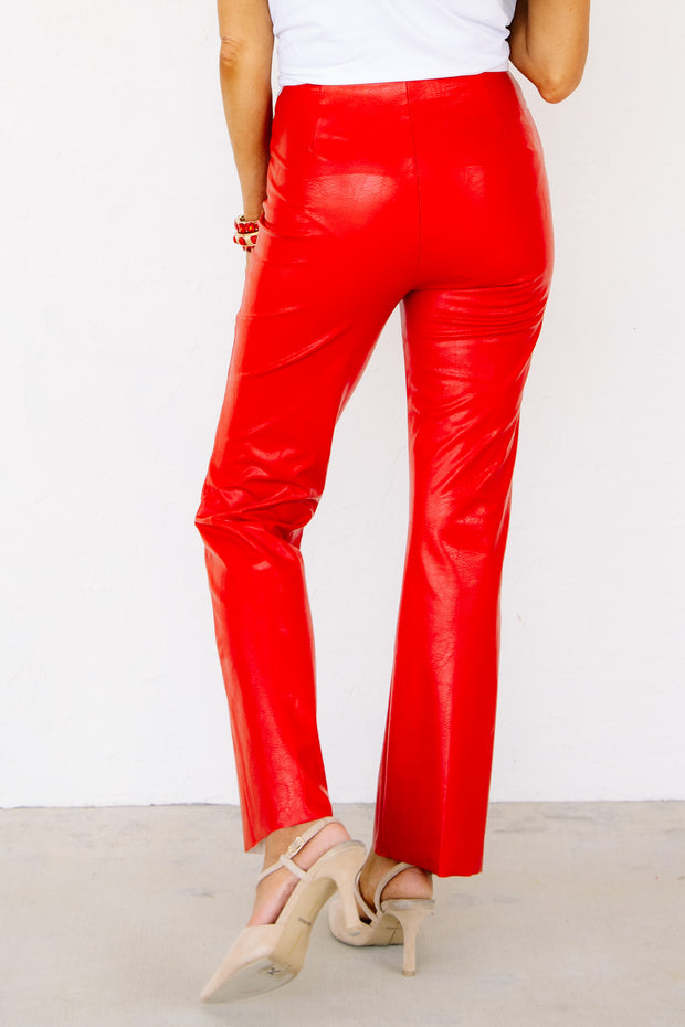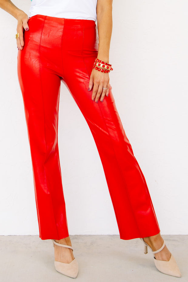 The Lysse Elysee Red Faux Leather Straight Leg Pants combine style and comfort with their soft, comfortable material. Featuring an elastic pull-on waistband, they offer an easy fit and a sleek, straight leg silhouette for versatile wear.