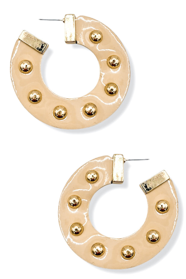Crafted with leather and studded detailing, these hoops make a statement and easily complement any white outfit. Elevate your look with confidence and versatility.