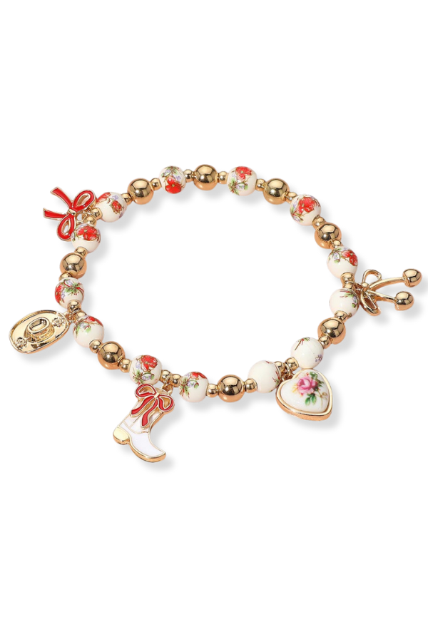 This bracelet features a ceramic ball design with an enamel bow, a western cowboy boot, and a heart charm. The stretch bracelet combines style and comfort, perfect for adding a touch of western flair to any outfit.