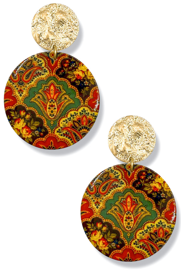 Stylish multicolor printed acrylic earrings with elegant gold circle drop. The lightweight design ensures comfortable all-day wear, making them perfect for both casual and dressier occasions.