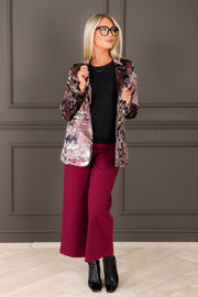 This waist-length blazer features a top collar, long sleeves, and a button-down front for easy wear. Its abstract print adds a modern touch to any outfit, making it a versatile choice for both casual and dressy occasions.