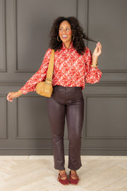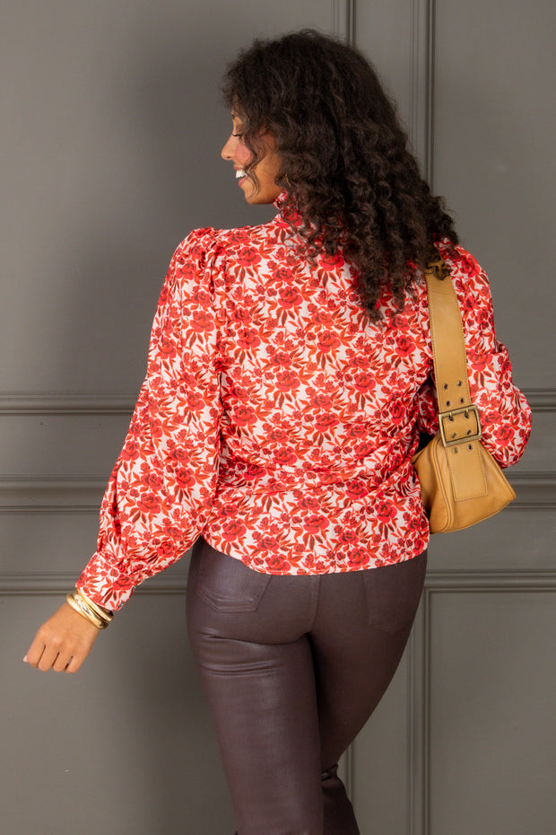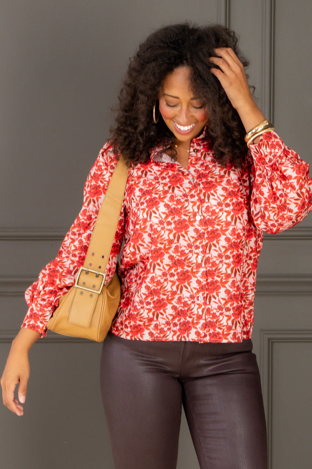 This waist-length blouse features a top collar, long sleeves, and a button-down front, adorned with a vibrant abstract red print for a bold, stylish look.