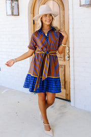 This Dress features a stylish top collar and a flattering mini length. It includes convenient side pockets and a button-down front for easy wear. A waist tie adds shape for a comfortable fit, while short sleeves keep it light and breezy.