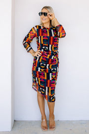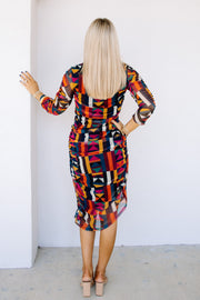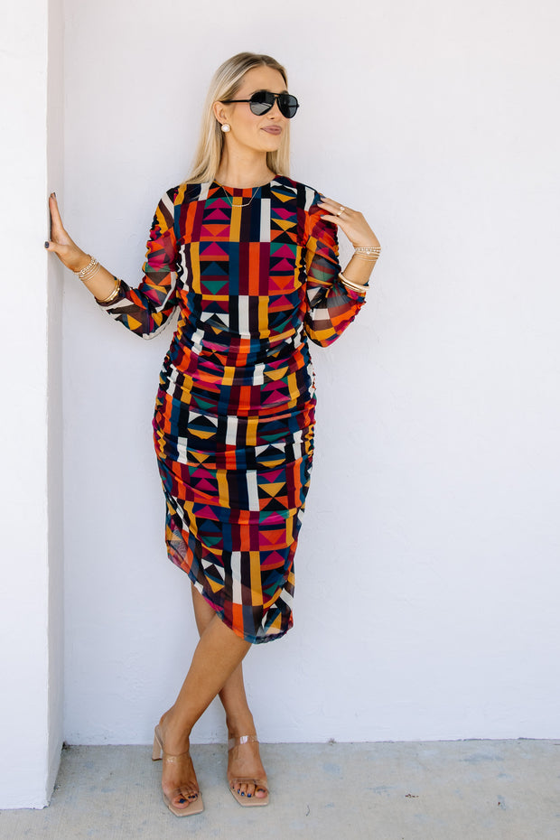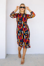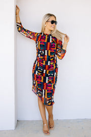 This Midi Dress features a rounded neckline and long sleeves for a classic look. Its bodycon silhouette highlights your shape, while the midi length adds elegance. The dress is adorned with an abstract print and includes an inner lining for comfortable wear throughout the day.