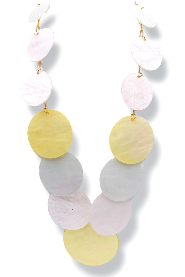 Featuring a beautiful assortment of Celluloid Acetate disc charms. This statement necklace will add a touch of elegance to any outfit. It is lightweight and comfortable to wear.