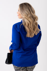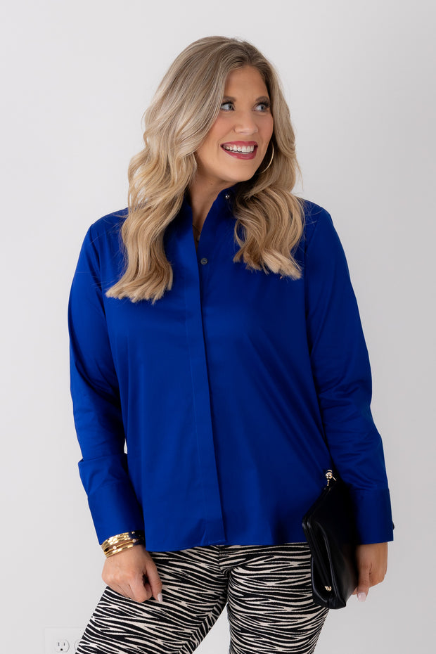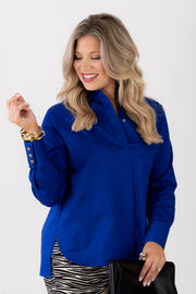 This simple blue topaz top stands out with dramatic details like oversized triple-button cuffs adorned with pearls and a single pearl at the collar. Made from stretchy matte sateen, it offers comfort and shape retention. The streamlined fit features a high-low hem and a button-front placket with an elegant enclosed design.