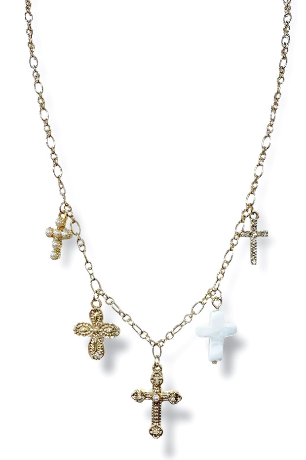 Delicate cross charm necklace featuring multiple layered pendants. Perfect for everyday wear or meaningful gifting. Versatile design complements any style.