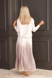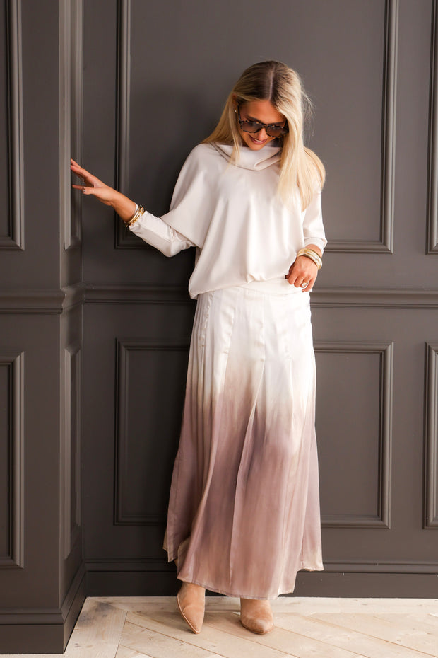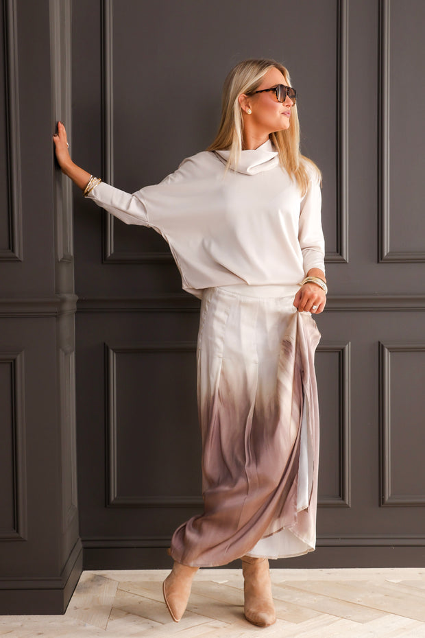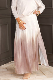 The Insight Novelty Cafe Ombre Maxi Skirt features a smooth, satin-like fabric with a beautiful ombre effect. Its elastic waistband and hidden side zipper ensures a comfortable fit, and a slit on the side making it a versatile piece that pairs effortlessly with any top or style.