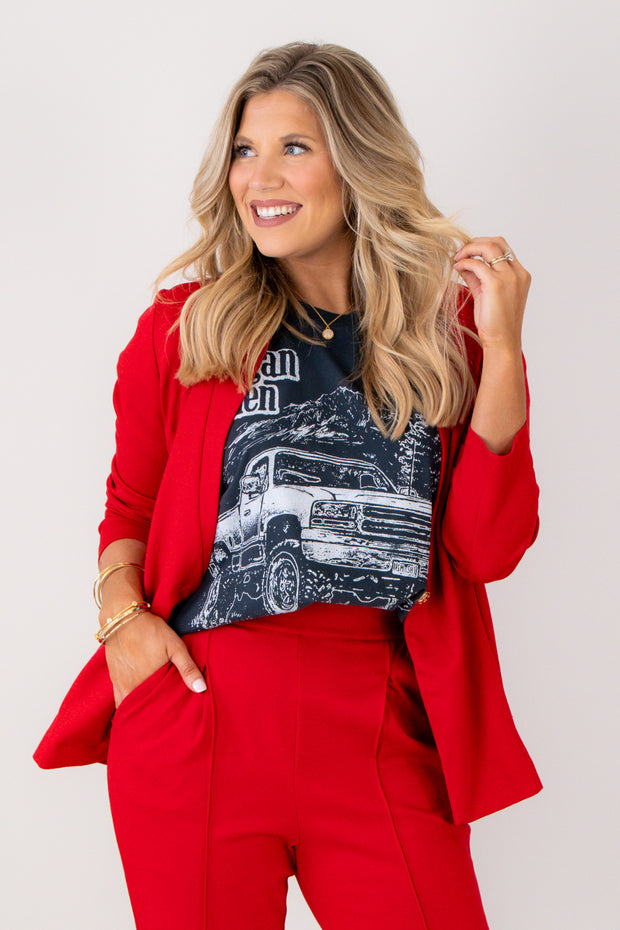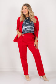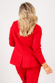 This red long sleeve blazer features a top collar and a flattering V neckline, combined with practical side pockets. Its clean design offers a polished and versatile look, perfect for both work and casual occasions.