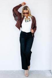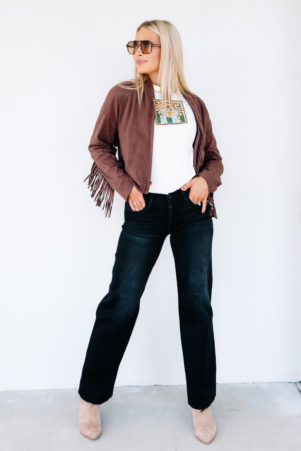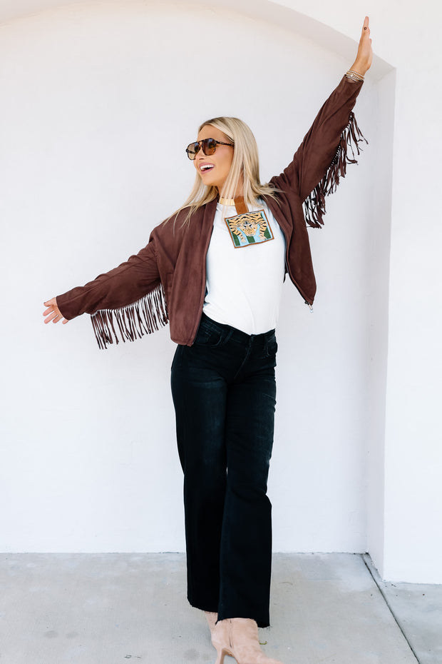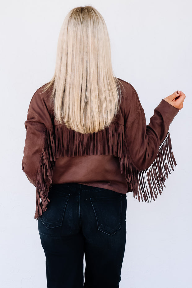 This long sleeve dark brown jacket features a V neckline, a zip-up front, and fringe accents on the back. Designed with side pockets, it combines style and practicality in a comfortable vegan suede material.
