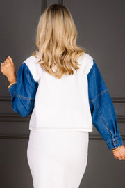 Cream long sleeve jacket with classic denim detailing, button-down front, and waist-length cut. Features a structured top collar and timeless style perfect for layering.