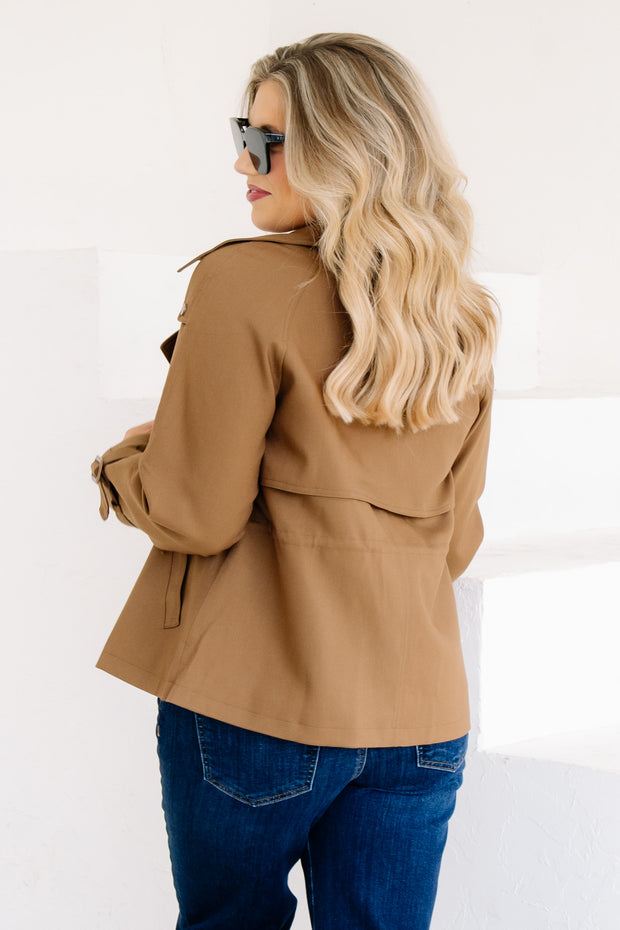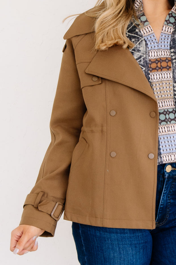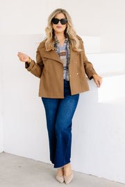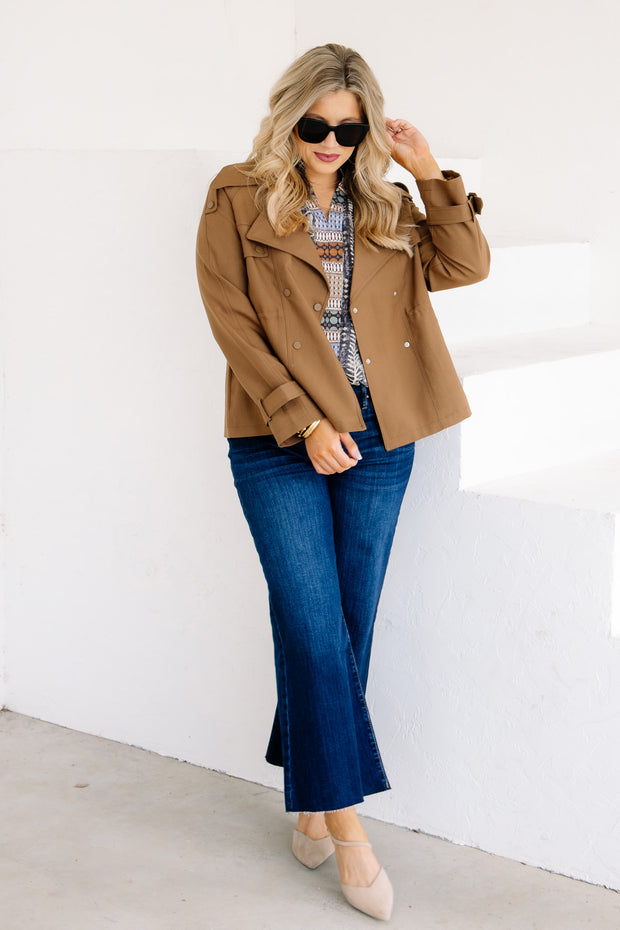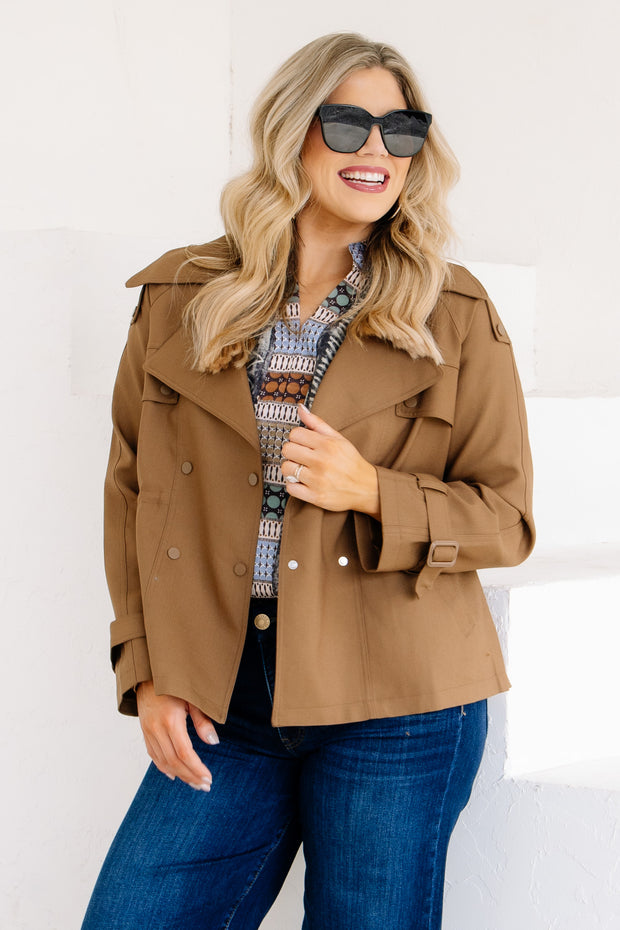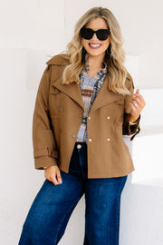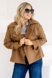 This cognac cropped trench coat features long sleeves, a V-neckline, and a clasp closure for a sleek look. It includes a top collar and side pockets, combining style and practicality in one versatile piece.