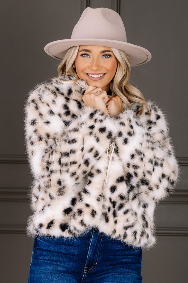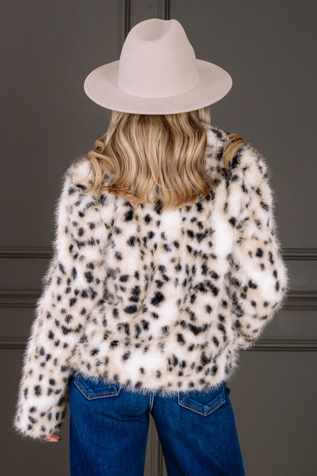 Candice Snow Leopard Faux Fur Long Sleeve Jacket