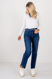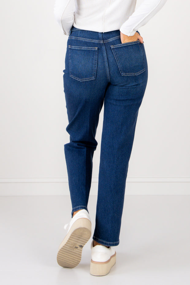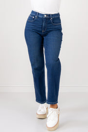 These Straight Jeans feature a straight silhouette with side pockets and a dark wash, finished with a front zip and button closure for a sleek fit.