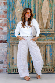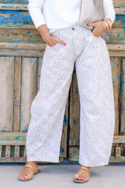 These brown barrel pants feature a front zip button closure and an abstract print for a modern look. Designed with side pockets, they offer convenient storage while maintaining a comfortable