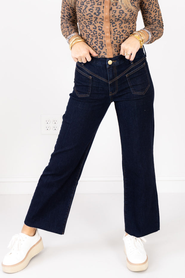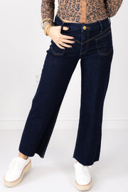 These Jeans feature a dark denim color and a trendy cropped length with a raw hem for a casual look. They include functional pockets and a front zip with button closure for easy wear and practicality.