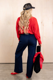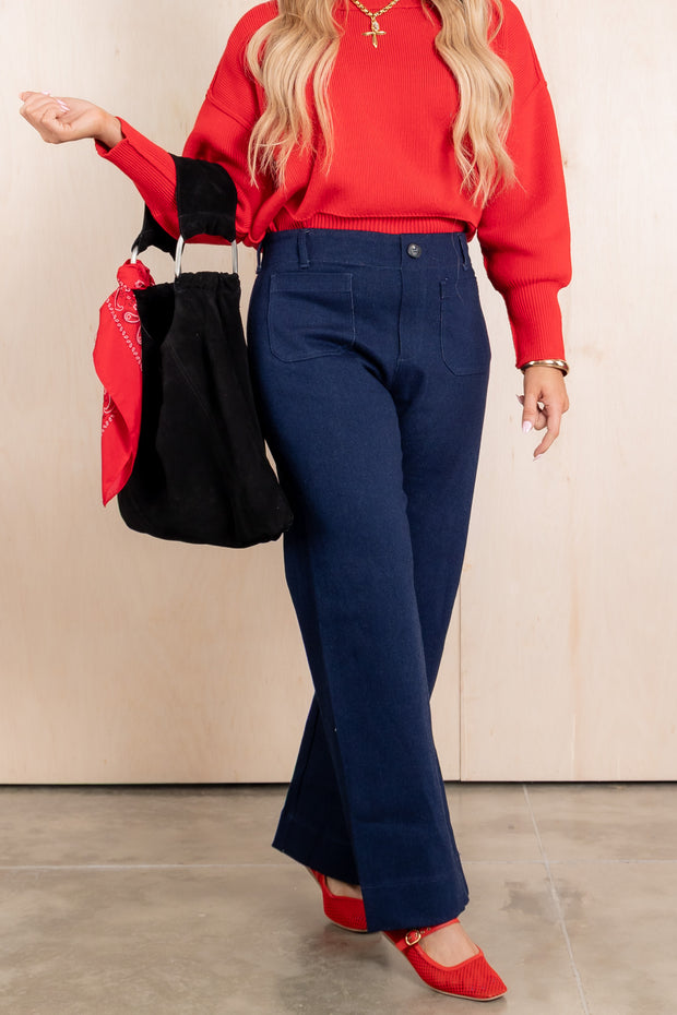 The High Rise Dark Denim Patch Pocket Pant offers a comfortable elastic pull-on waistband and a flattering wide leg fit. Featuring front and back pockets, these jeans combine style and practicality for everyday wear.