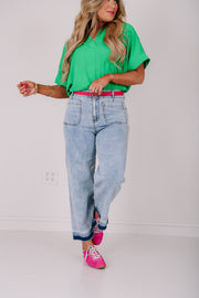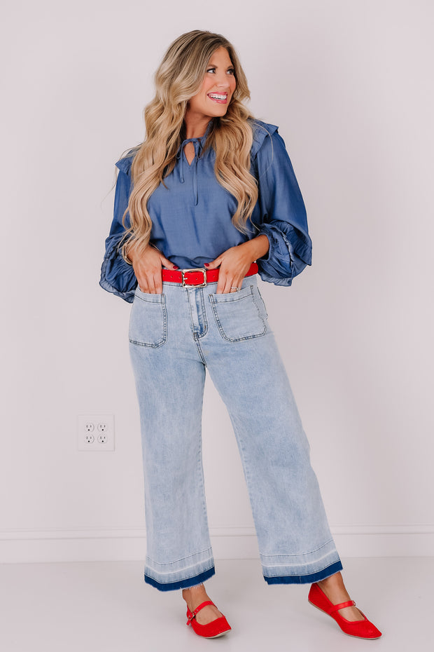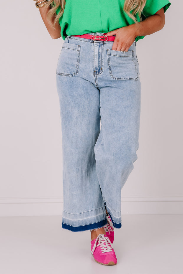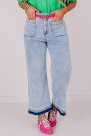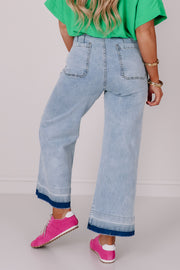 This Denim Cropped Jean offers a comfortable fit with its wide leg silhouette and wide leg bottom. It features a convenient front zip button closure and showcases a stylish light wash, making it a versatile addition to any casual wardrobe.