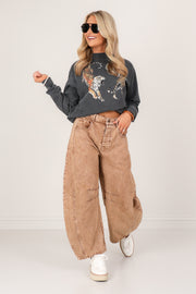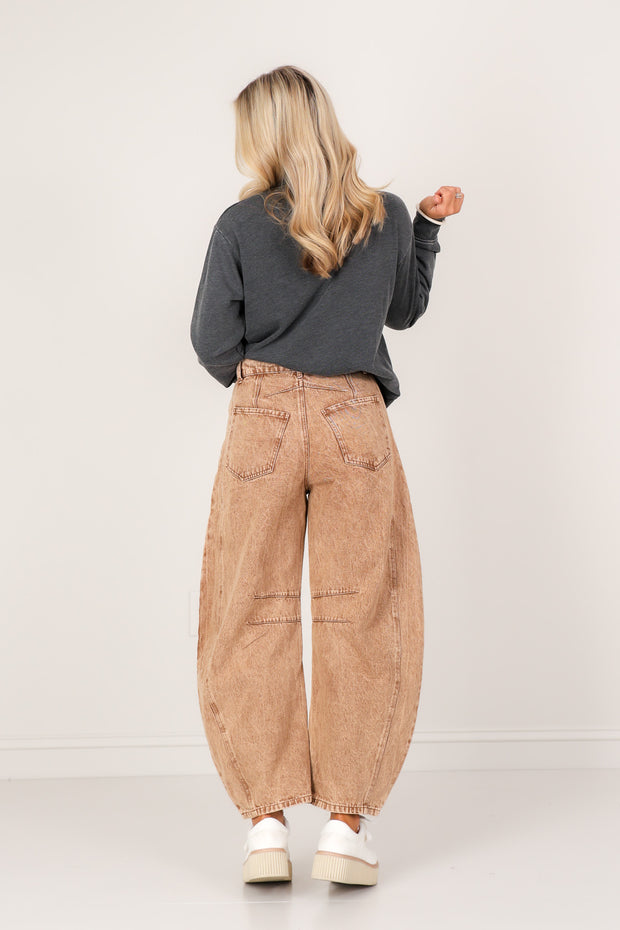 This Barrel Jean features a comfortable mineral wash finish and a stylish barrel silhouette. Designed with practical side pockets and a front zip button closure, these jeans combine ease and functionality for everyday wear.
