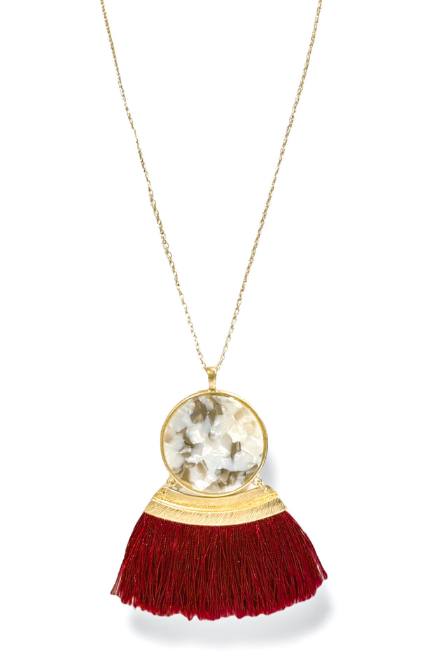 Been Through It Burgundy Gray Acrylic Disc & Tassel Necklace
