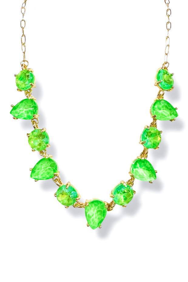 Elegant stone link necklace featuring teardrop, round, and oval gemstones in a cushion setting. Perfect for evening wear, this versatile piece adds sophisticated sparkle to any occasion.