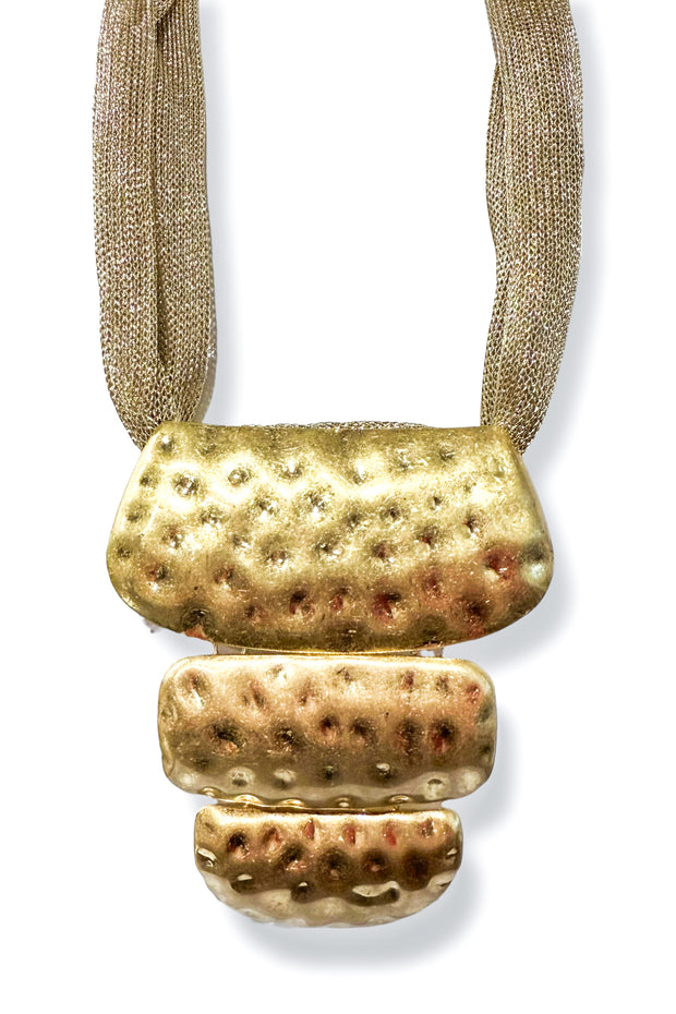 Striking pendant with hammered geometric design and mesh fabric detailing. Bold statement piece that elevates any outfit with modern sophistication and eye-catching style.