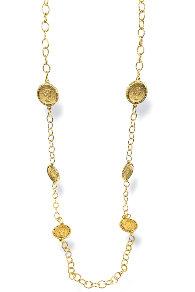 Striking necklace adorned with Queen Elizabeth II coins scattered throughout the design. A meaningful piece that blends numismatic elegance with contemporary jewelry craftsmanship.