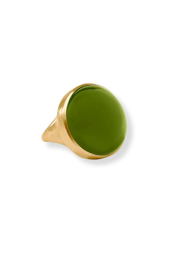 Bold statement glass stone set in a gold ring.