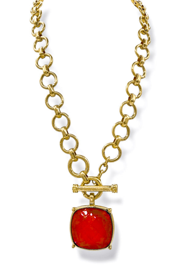 Featuring a vibrant deep red stone and elegant toggle detail, this gold statement necklace is both eye-catching and sophisticated. Elevate any outfit with this exquisite piece.