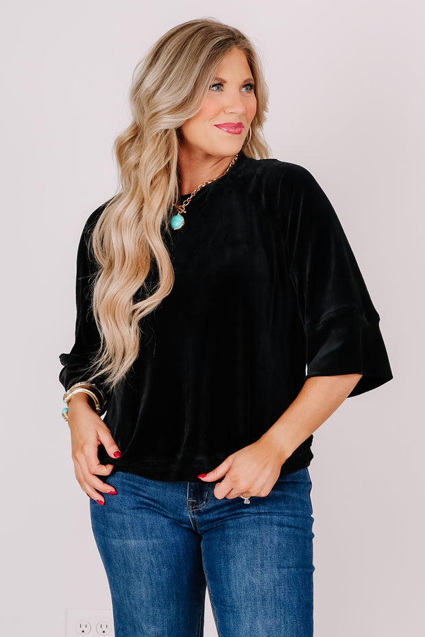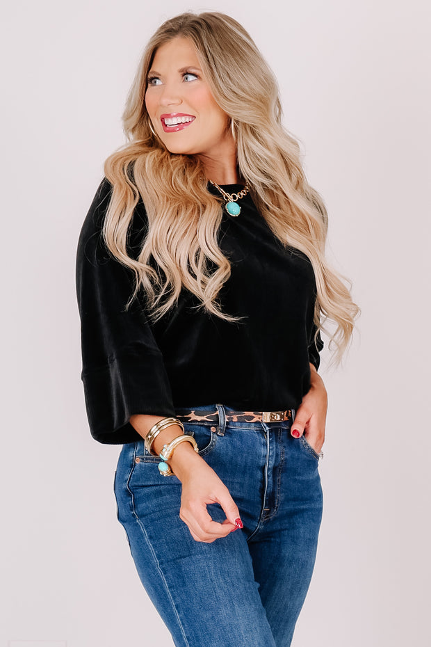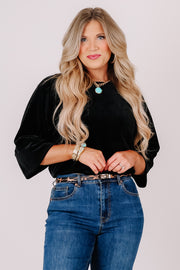 This Top features a soft velvet feel with a flattering rounded neckline and short sleeves. Its waist-length cut offers a comfortable, stylish fit perfect for everyday wear.