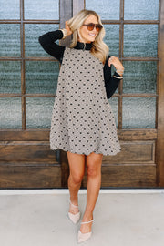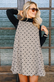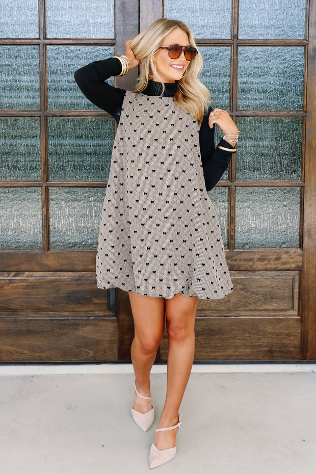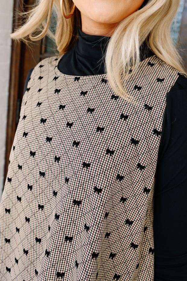 The Marie Brown Sleeveless Bubble Mini Dress features a brown houndstooth pattern with bow details all over. It has a round neckline, button closure on the back, and convenient side pockets, combining playful style with practical design.