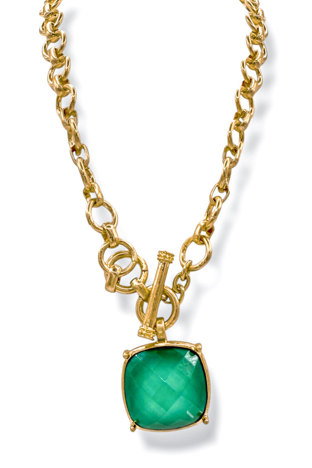 Featuring a vibrant Green stone and elegant toggle detail, this gold statement necklace is both eye-catching and sophisticated. Elevate any outfit with this exquisite piece.