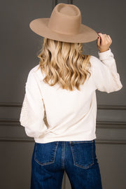 Cozy crew neck sweatshirt featuring lace-detailed long sleeves and a waist-length cut. Perfect for layering or wearing solo, this cream piece combines comfort with intricate tribal-inspired design for effortless everyday style.